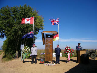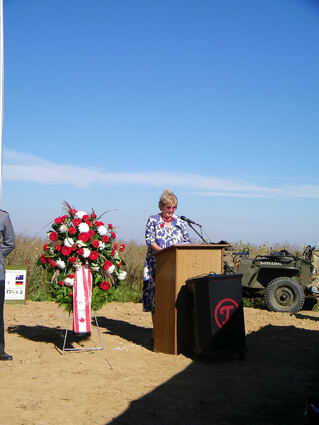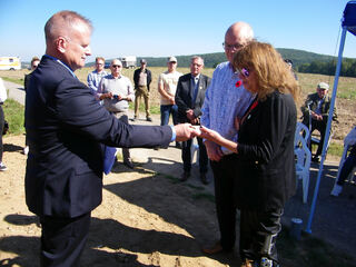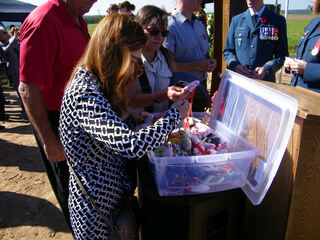 Initiator Eric Wieman (IG Heimatforschung) übergibt einen Button der kanadischen Luftwaffe an Patricia Hunter, deren Onkel ums Leben kam.