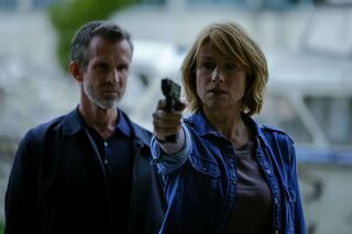 STEINBRUCH. Karen (Corinna Harfouch) lernt schießen. Bruno (Ulrich Matthes)