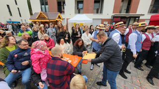 Bürgermeister Achim Weitz verteilt den Kerwekuchen.