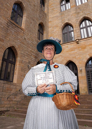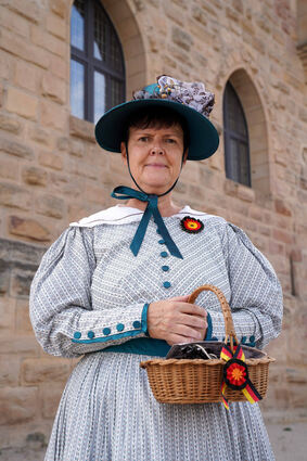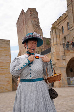 Constanze Ertel nimmt die Besucher mit auf eine Zeitreise ins Jahr 1832 und schlüpft in die Rolle einer Frau, die die Gäste zum Hambacher Fest begleitet.