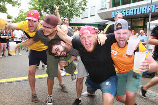 sho_oe_Fanmeile3.jpg Hockenheim Fanmeile, vl Mark, Chris, Paul und Sam aus England 28.07.2019 © M.Oechsler