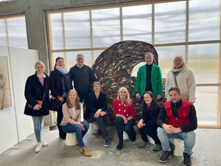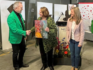 Der Kunstverein übergibt Kultusministerin Theresa Schopper das Geschenk der Schüler.