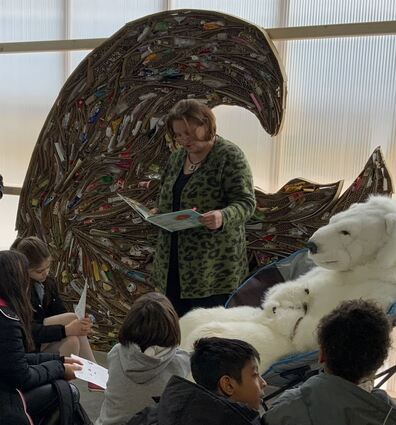 Kultusminsiterin Theresa Schopper liest Kindern vor dem Kunstwerk der Müllwelle des Gauß-Gymnasiums vor.