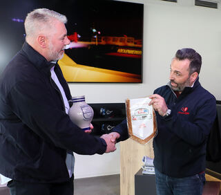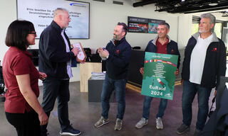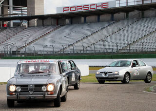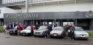 Erinnerungsfoto am Welcome Center des Motodroms. Die Mitglieder von "CinemAlfa" (Kombination aus Cinema und Alfa Romeo), einem italienischen Automobilverein, machen auf ihrer Tour mit dem Titel "EuRaid 24" Stopp in der Kurpfalz.