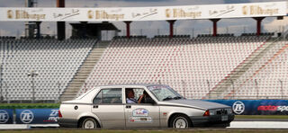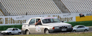 Francesco Lilli aus Rom lenkt konzentriert seinen Alfa Romeo Giulia Super 1.3 über den Hockenheimring. Ein Highlight für ihn und sicher auch den Wagen, Baujahr 1973.