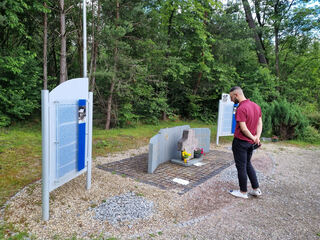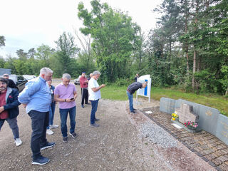 Die Inschrift am Gedenkstein wird genau gelesen.