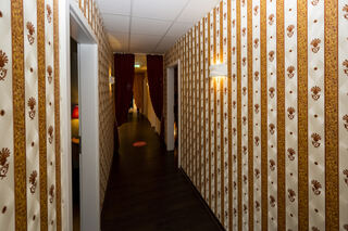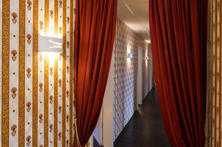Der rote Vorhang im Flur trennt die Zimmer vom Eingang ab.
