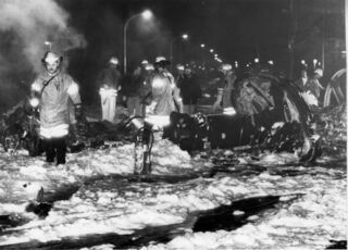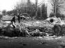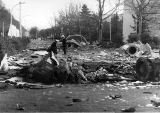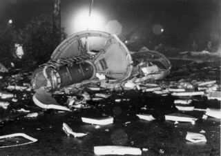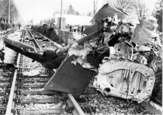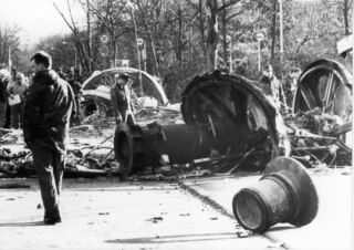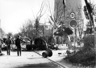 Hubschrauberabsturz Mannheim, 5. Dezember 1994: Bis auf die Gleise der OEG sind Trümmer geflogen. Teile des Rotors werden sich später auf einem Hausdach finden.