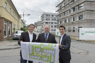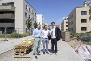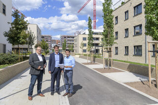 Haben das neue Höllenstein-Quartier am 19. August besucht (v.l.): Gerald Kraus (GGH), Bürgermeister Jürgen Odszuck und Projektleiter Sebastian Streckel (GGH).