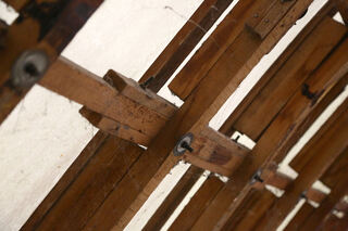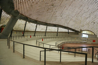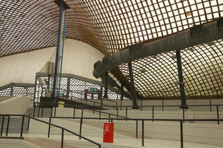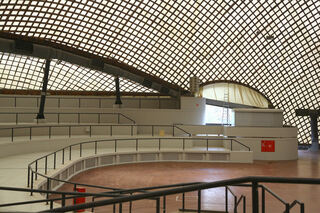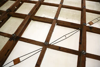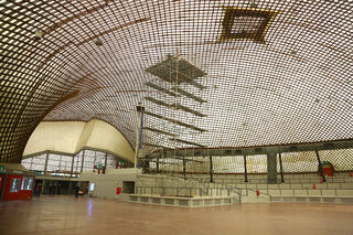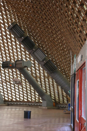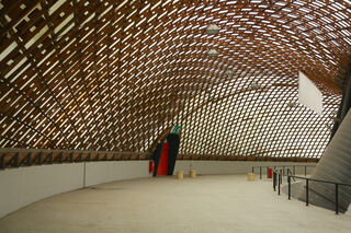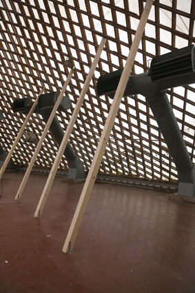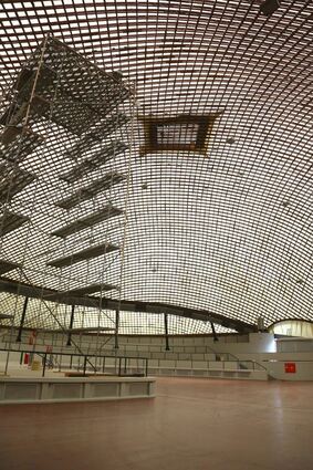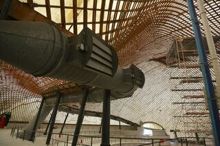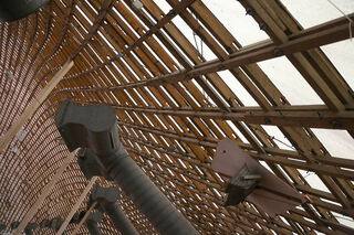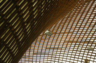 eine Halle mit einem mehrfach gekrümmten Gitter aus bis zu 35 Meter langen Holzleisten.