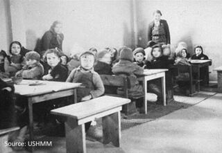 Ein Klassenzimmer im Lager Rivesaltes. Im März 1942 wird Werner von seiner Familie getrennt und findet Aufnahme im Schloss Montintin, einem Heim für 100 jüdische Kinder. Kurt wird ebenfalls gerettet und kommt ins Schloss von Charry. Die Eltern werden nach Auschwitz deportiert und ermordet.
