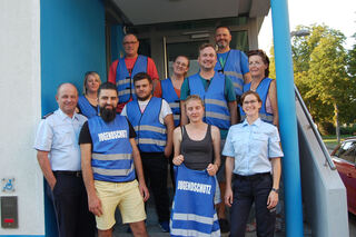Präventionsaktion "Hart am Limit" (HaLT): Links Polizeirevierleiter Michael Heitlinger, rechts Caroline Brosamer (seine Vertreterin). Hinter ihr Julie De Marco, daneben Timo Kläser, oben rechts Oliver Quack. Links aussen Bertram Stolz. Dazwischen die jugendlichen Ehrenamtlichen.
