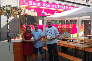 Verkaufsoffener Sonntag: Baan Boonya, Jürgen Klein und Koch Albert Mangold mit den thailändischen Kokusnüssen