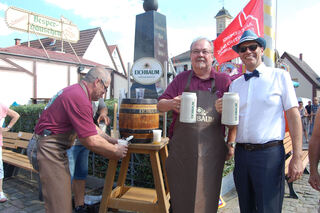 Rudi Lellek (2. Vorsitzender), Peter Siegmann (1. Vorsitzender) und Jürgen E. Wolf beim Fassbieranstich.