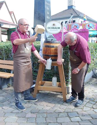 Rudi Lellek (2. Vorsitzender) und Peter Siegmann, 1. Vorsitzender des ASV Sandhofen, beim Fassbieranstich.