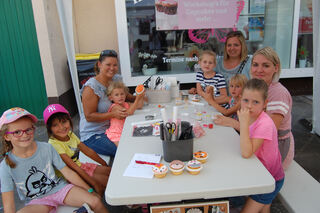 Malia, Hanna, Leonie, Lena, Lia und Dea mit Anita Redweik und Tanja Wagner beim Workshop für Cupcakes von Gloria Stupp.