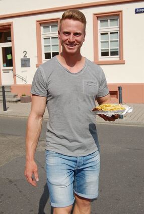 Feuerstreiter Pascale Dieffenbach von der Mannheimer Berufsfeuerwehr stärkt sich auf der Kerwe nach seiner Tour über die Alpen.