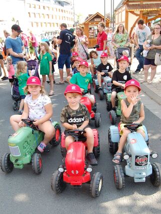 Kinder führen den Kerweumzug mit ihren Traktoren an.