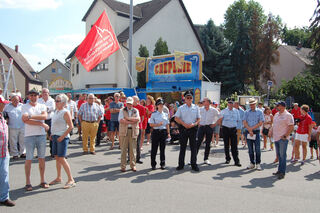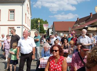 Das Kerweteam (v.l.) Bettina Herbel, Roland Keuerleber, Bernd Mechnig-Diehl und Thomas Sprengel von Event & Promotion mit weiteren Zuschauern bei der Eröffnung.