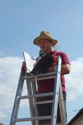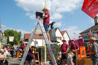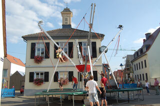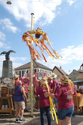 Der Kerwekranz ist bestückt mit neuen Bändern, die Kerwebagage zieht ihn hoch.