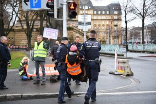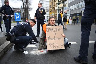 Klimaaktivisten haben am Freitagvormittag den Friedrichsplatz vor dem Rosengarten blockiert.