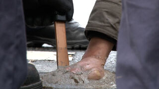 Erst die angeforderte Berufsfeuerwehr konnte die Hand mit Hammer, Meißel und Fingerspitzengefühl vom Asphalt entfernen.