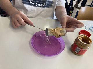 Dazu strichen die Schüler Erdnussbutter auf eine Papprolle. Maurice ist mit Spaß dabei.
