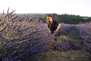 Anne Gaul bei der Arbeit. Die Ernte auf dem Lavendelfeld zwischen Grünstadt und Obrigheim findet in Handarbeit statt - mit den Sicheln des Großvaters