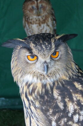 Wacher Uhu mit schlafender Waldohreule gesehen auf dem Mittelaltermarkt im Herzogenriedpark