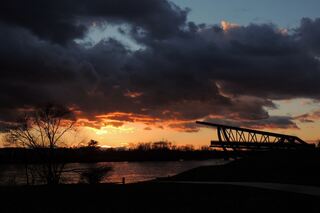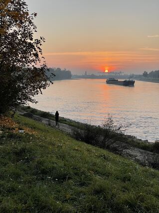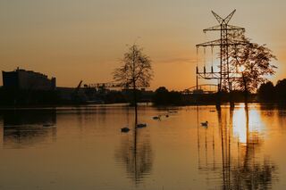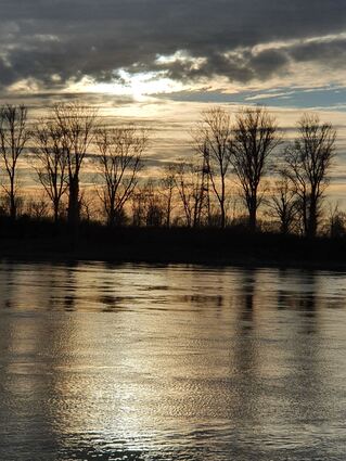 Von Ladenburg aus gesehen über Neckarhausen hinweg sieht man die Sonne hinter dem Großkraftwerk Mannheim untergehen dem