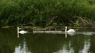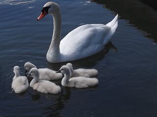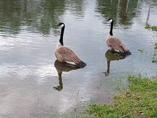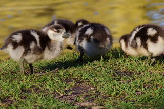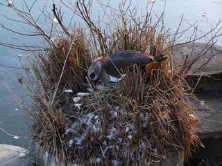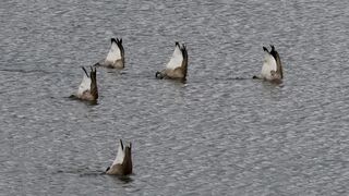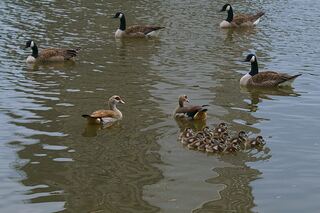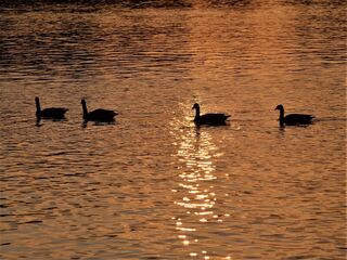 Wildgänse schwimmen zu ihrem Nachtquartier