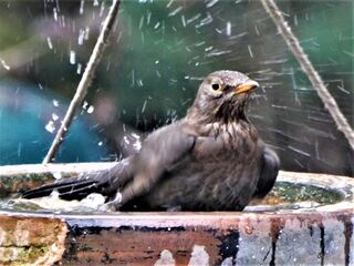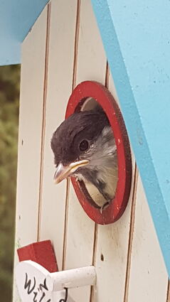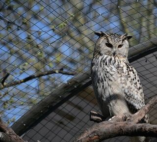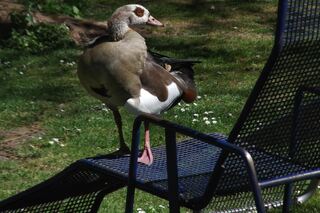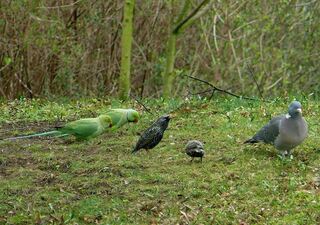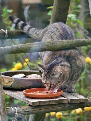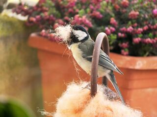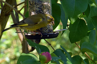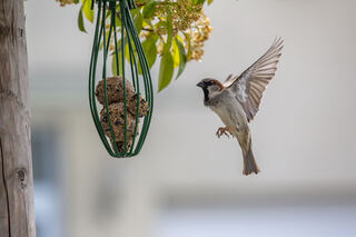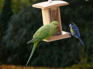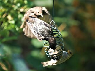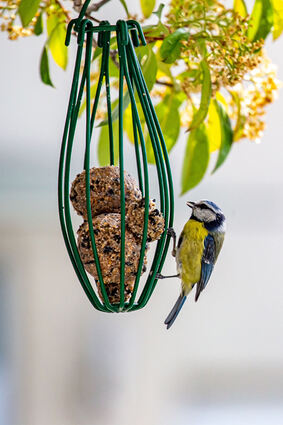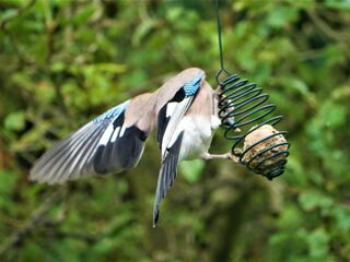 Dieser Eichelhäher möchte auch etwas abhaben vom Meisenknödel, auch wenn es schwierig ist