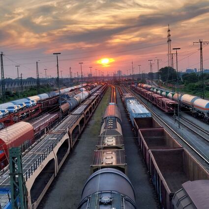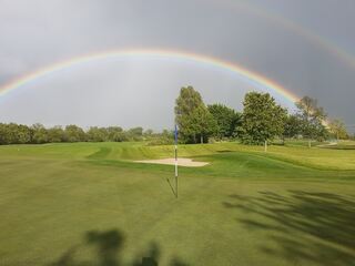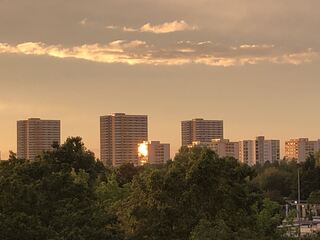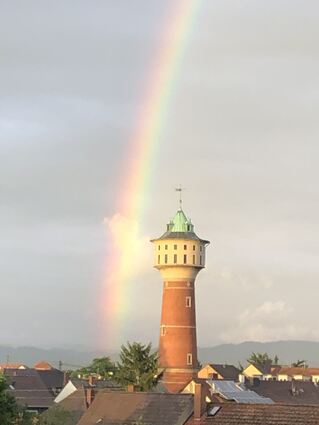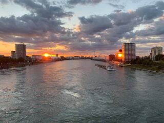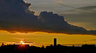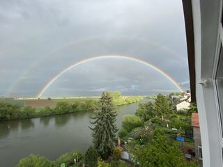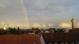 Regenbogen im Feuer des Abendhimmels über Mannheim mit Blick Richtung Odenwald