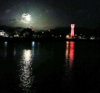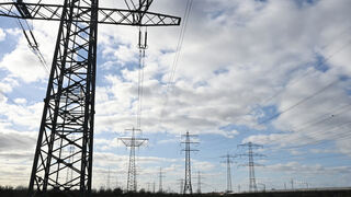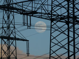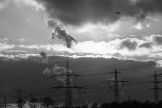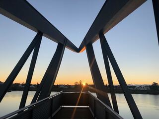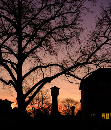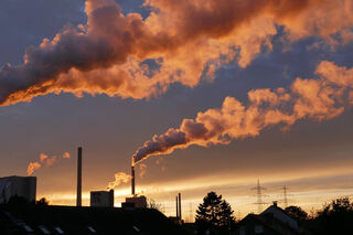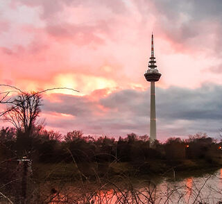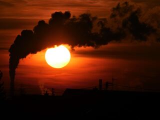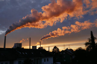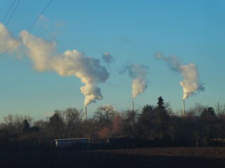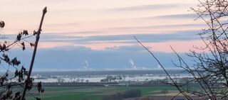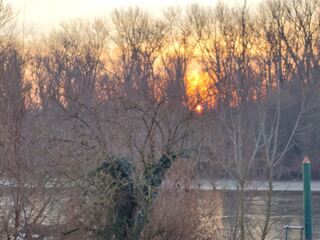 Von Ladenburg aus gesehen über Neckarhausen hinweg sieht man die Sonne hinter dem Großkraftwerk Mannheim untergehen dem