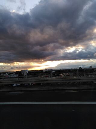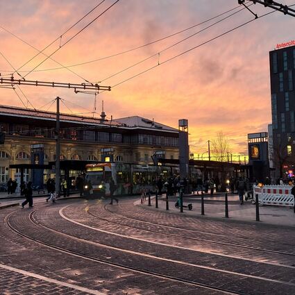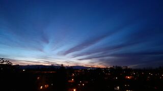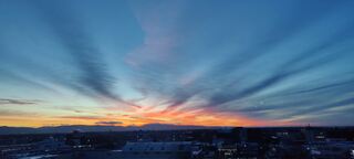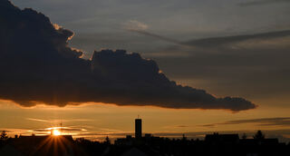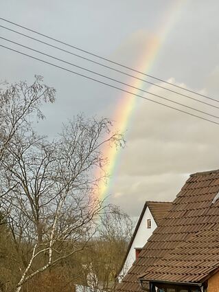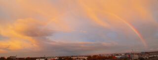 Regenbogen im Feuer des Abendhimmels über Mannheim mit Blick Richtung Odenwald