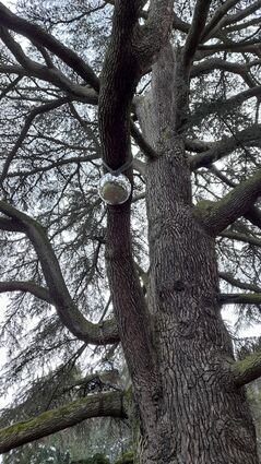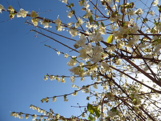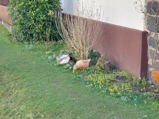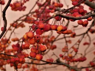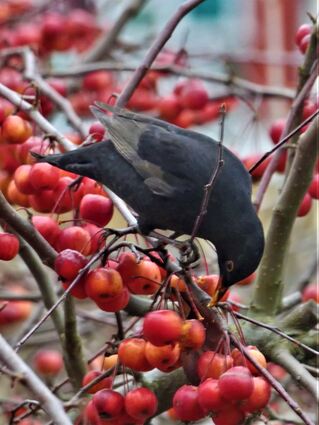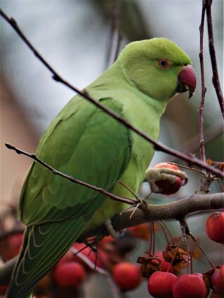 Dieses Jahr hängt unser Zierapfelbaum besonders voll. Nach den frostigen Tagen um den 4.Advent herum sind sie jetzt so süß und weich, dass nun Halsbandsittiche zum Fressen kommen.