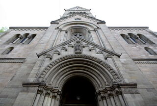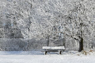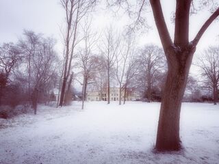 Blick durch den winterlichen Park auf die Lutherkirche in Neckarhausen