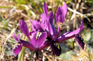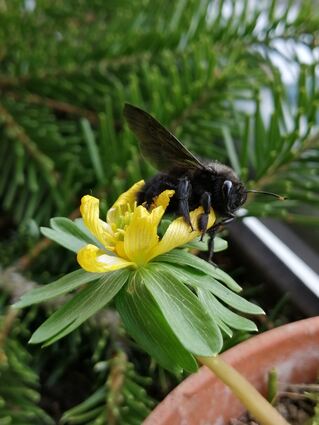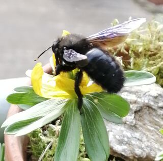Viel zu früh geweckt an den warmen Februartagen:eine große Holzbiene auf Winterling