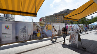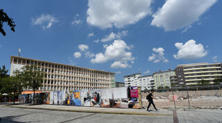 Noch spiegelt sich das "Tortenschachtel" genannte Gebäude im Wasser des Brunnens "Conversation" auf dem Berliner Platz ...