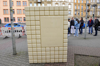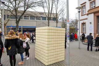 "Ein Klotz, der im Weg steht", so sieht der Initiator das Werk, das jetzt vor den Bürgerdiensten in K7 steht und an die Opfer von Zwangssterilisation erinnern soll.
