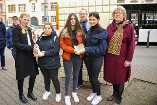 Lilli Strohfeldt (Moll-Gymnasium) übergibt den Stein an Desidera Basi (Luzenberg-Justus) und Sara Özdemir. Özdemir (Elisabeth-Gymnasium) übergibt den Stein an Nisa Selen Donat (Merkur Akademie), hinten Bildungsbürgermeister Dirk Grunert (Grüne), rechts Umweltbürgermeisterin Felicitas Kubala.