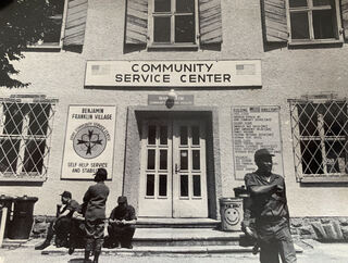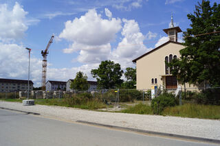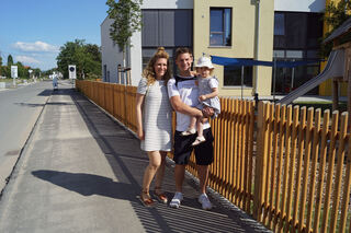 Matthias und Miriam Schüler mit ihrer kleinen Tochter Matilda vor dem Kindergarten, der genau gegenüber ihres Zuhauses liegt.