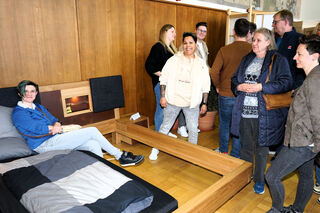 "Quercus Somnum" nennt Jessica Enders (33) aus Heidelberg ihr Bett, das aus Massivholz hergestellt ist. Das Kopfteil hat beleuchtete Fächer. Bild: Widdrat