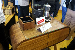 Bastian Dorando aus Mannheim bot sein Kaffeemöbel aus Nussbaum und Eiche zum Verkauf an. Bild: Widdrat