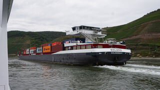 Überholt von einem großen Containerschiff auf dem Rhein.