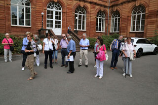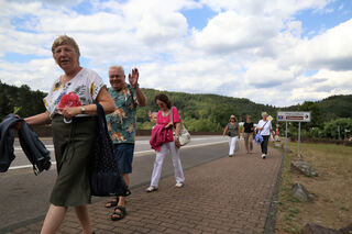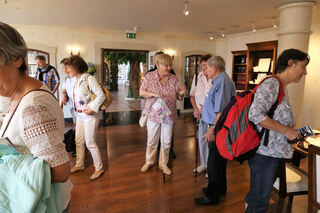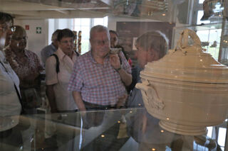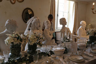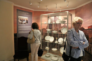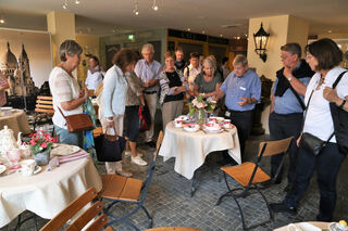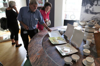 Die Gäste bewundern das Hochzeitsgeschirr.