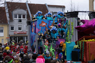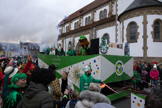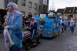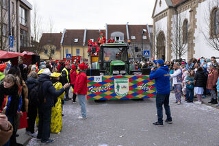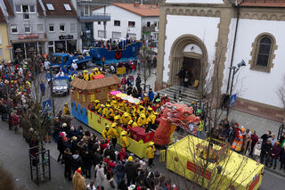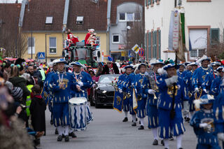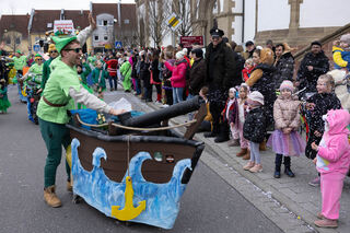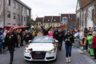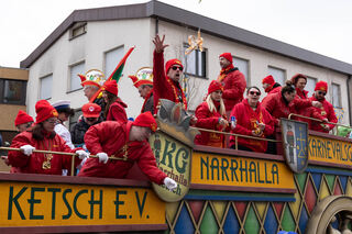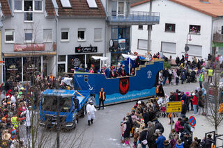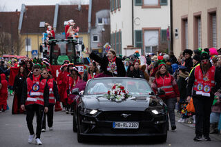 Die letzte Zugnummer ist der Elferratswagen der KG Narrhalla Ketsch. Im Vordergrund Moderator und "Ketscher Bu" Bernd Bürkle.
