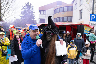 Moderator Bernd Bürkle im Gespräch mit einer Hexe.