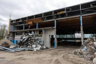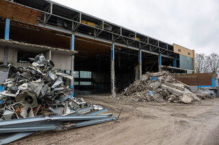Vor der Halle stapeln sich die alten Gebäudeteile.