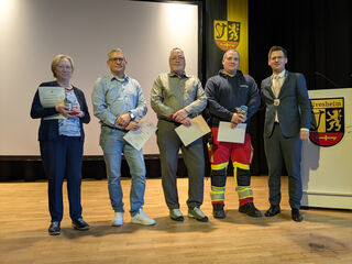 Auch Blutspender wurden vom Bürgermeister (der rechts steht geehrt). Die Spenderinnen und Spender waren (v.l.): Helga Grabenauer, Thorsten Schwöbel, Frank Thoma und Timo Christner.